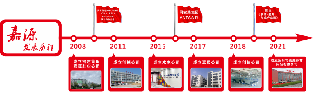 嘉源集团前身为莆田嘉源鞋业有限公司,成立于2008年,经过十余年的不懈努力发展成为了一家集品牌、贸易、研发、制造于一体的现代化鞋业集团。旗下拥有福建省莆田嘉源鞋业有限公司、福建省嘉辰体育用品有限公司、达州市嘉源体育用品有限公司、福建木木商贸有限公司、莆田市创博鞋服有限公司、福建省创信新材料科技有限公司等六家鞋类配套产业公司,集团现有员工2200人,其中专业技术类人才380人,中高端管理类人才100人,集团长期与安踏/ANTA、斯凯奇/SKECHERS等国内外知名运动品牌保持良好的合作关系。