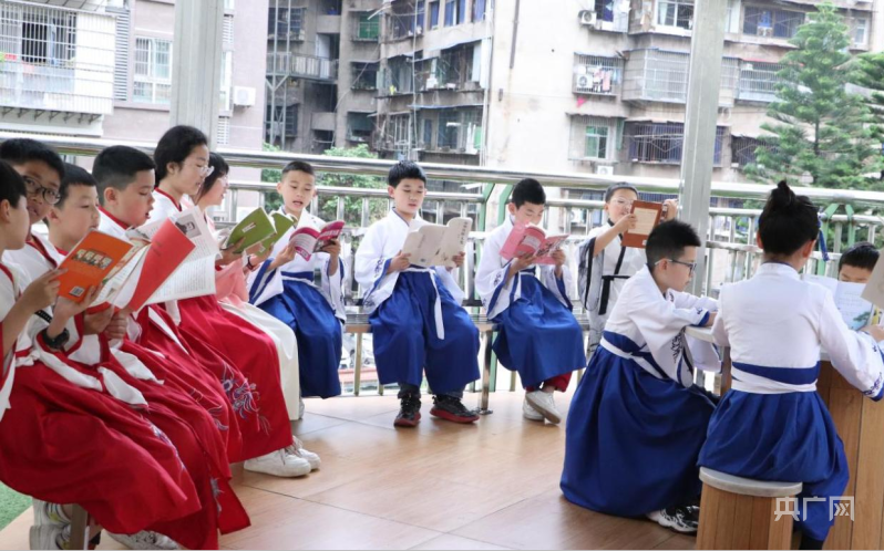 在渠县第三小学读书长廊,琅琅书声不绝于耳,小学生们或捧着唐诗宋词、或捧着国学经典在认真诵读。“从小教导孩子诵读经典,不仅符合儿童学习的天性,而且自幼就开始接受中华传统文化的熏陶,奠定一生儒雅人格的基础。”该校副校长包菡说,“我们也鼓励家长和孩子一起学习,从小树立孩子们的文化自信。”