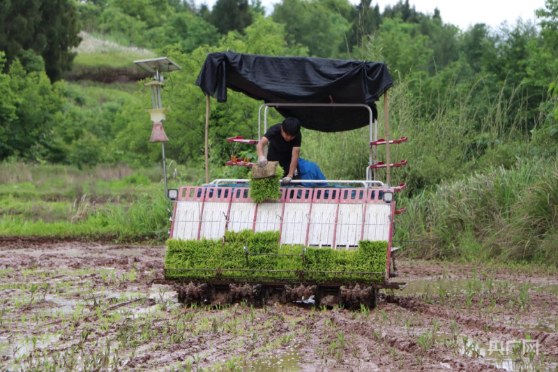 5月初,在渠县有庆镇太阳村广阔的稻田里,一盘盘嫩绿的秧苗被搬上插秧机,伴随着轰鸣的机械声,农机手们驾驶着插秧机在田地间来回穿梭。熟练的操作下,一株株秧苗从秧盘上依次滑落,整齐有序地插入稻田里。